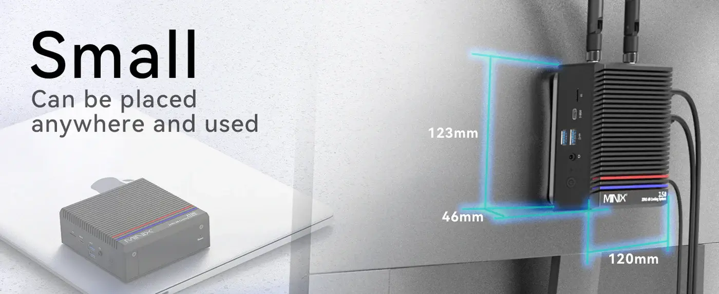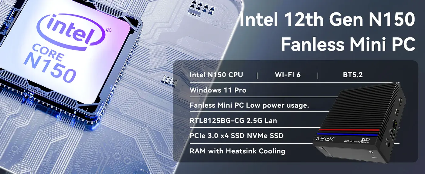 The MINIX NEO Z150-0dB, powered by the Intel N150 processor and featuring a completely silent fanless design, is a perfect mini PC solution for office, library, and home use. With 16GB LPDDR5X memory and a 512GB NVMe SSD, it delivers efficient performance for daily tasks, office applications, and multimedia experiences. Supporting dual 4K displays, along with Wi-Fi 6 and Bluetooth 5.2 connectivity, it easily integrates into modern work and entertainment environments. Its compact build and energy-efficient design provide a quiet and comfortable user experience.