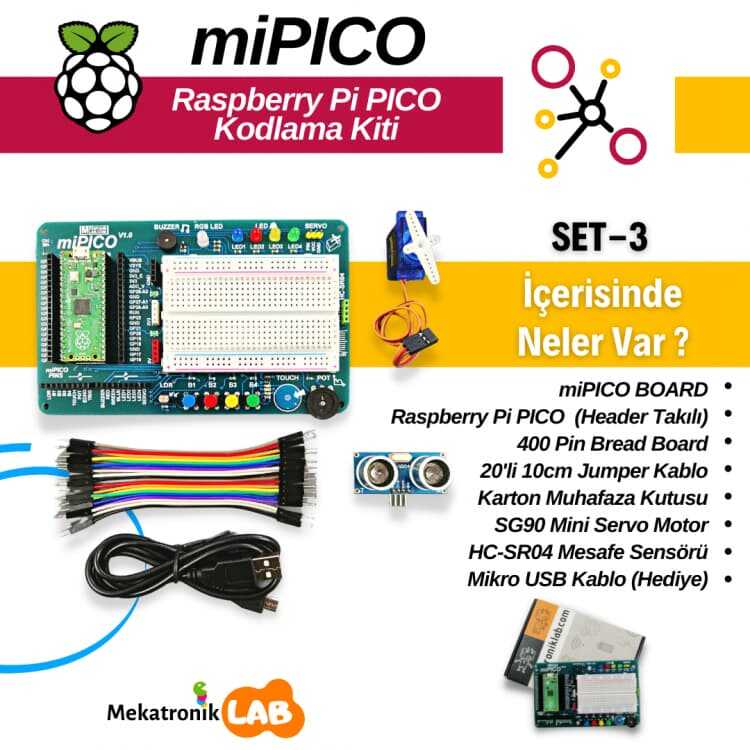 MiPico is a coding kit designed for Raspberry Pi Pico coding card. Thanks to the many modules on it, you can perform your applications quickly and easily. It is suitable for your robotic projects.