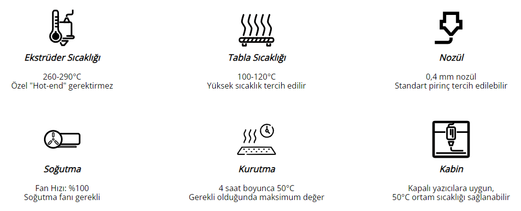 | Ekstrüder Sıcaklığı | 200-230°C | 200-230°C | 230-260°C | 220-260°C | 250-280°C | 260-290°C | 220-240°C |