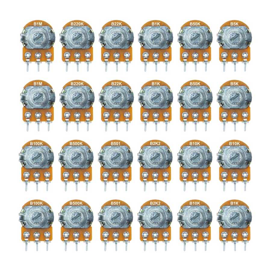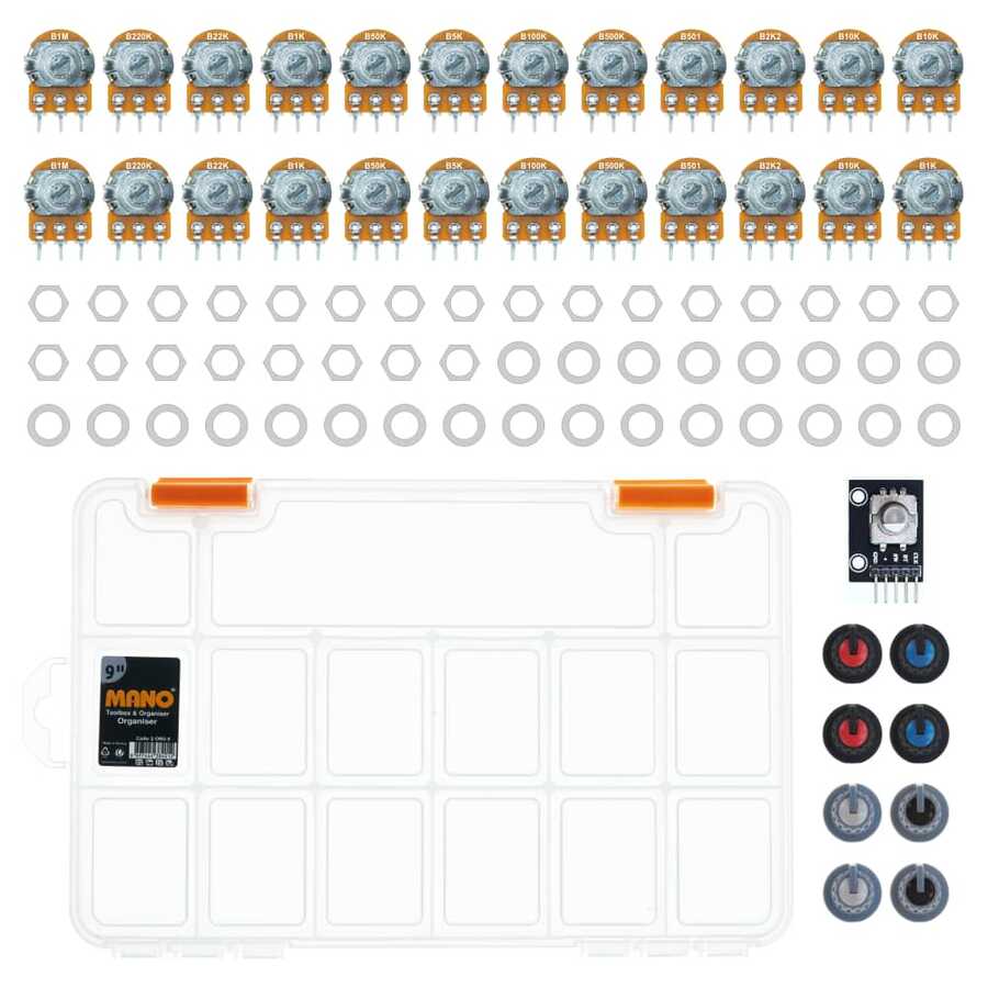 Gelince Haber Verİhtiyacınız olacak tüm metal mono potansiyometreleri içeren bir settir. Set içerisinde 12 çeşit 25 adet potansiyometre mevcuttur. Bu potansiyometrelerinizi rahatça kullanabilmeniz için 4 çeşit 8 adet potansiyometre başlığı da bulunmaktadır. Ayrıca potansiyometreleri değerlerine göre gruplandırılmış bir şekilde 9” mano organizer kutunun içinde gelmektedir.