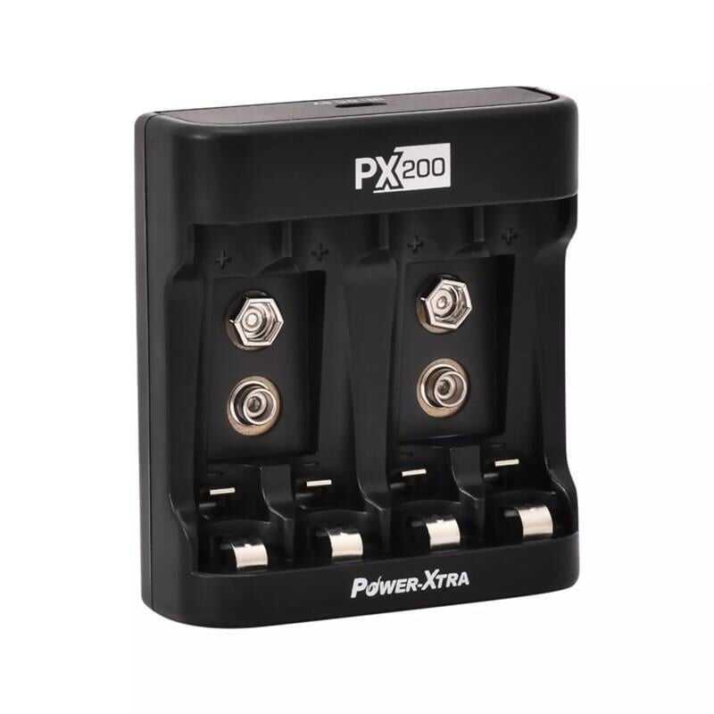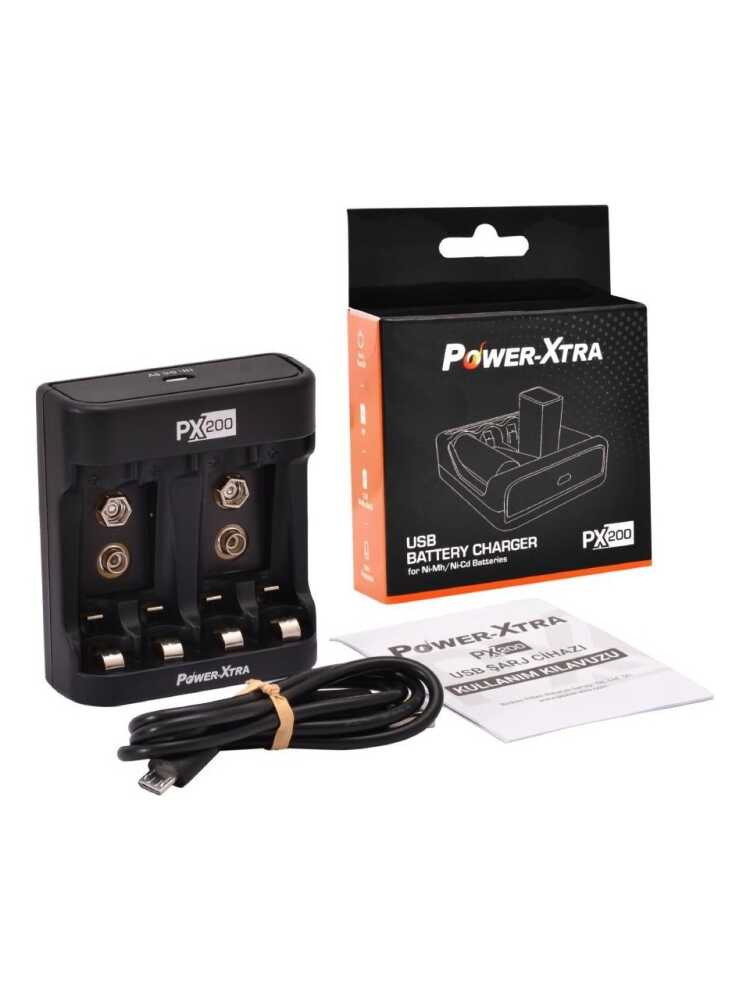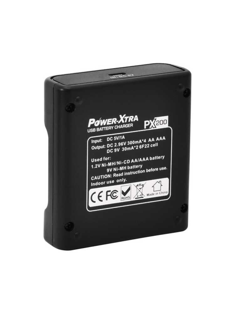 Power-Xtra PX200 is a compact, USB-powered battery charger designed for Ni-MH and Ni-Cd rechargeable batteries. Supporting AA, AAA, and 9V (6F22) battery types, it offers a practical solution for both everyday use and hobby or electronics projects. With its 4-slot design, it allows multiple batteries to be charged simultaneously while taking up minimal space on a desk or workspace.