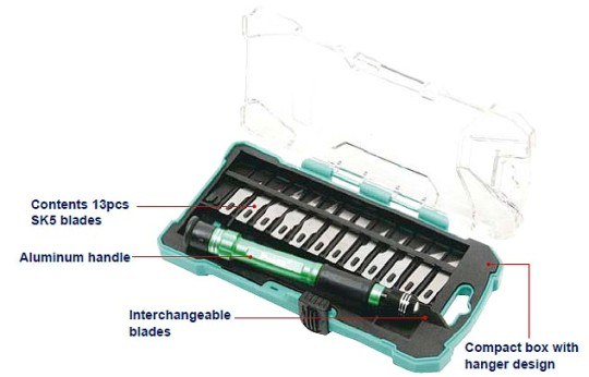 Notify me when its in stockThis knife kit is designet to cut anything in many areas like wooden, paper, handcraft of plastic, with its aluminum handle with rubber grip and 14 different blade type.
