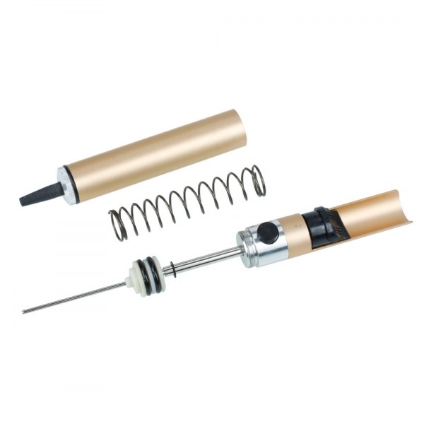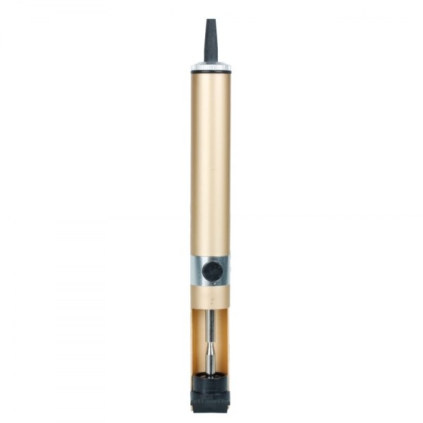 It is formed by a strong spring inside the body, a button to be used to compress this spring, another little button in the middle to release the spring and a little pipe at the end to suck up the soldering material. Pull the button on the top until it nests its place with a click sound. Then approach the sucker pipe of the pump to the preheated and melting piece of solder and press the little button to release the spring. This cause the assemble lever to turn back fast to the starting position. This process provides a low pressure place on the sucker pipe and the premelted solder goes to the inside of the pump.