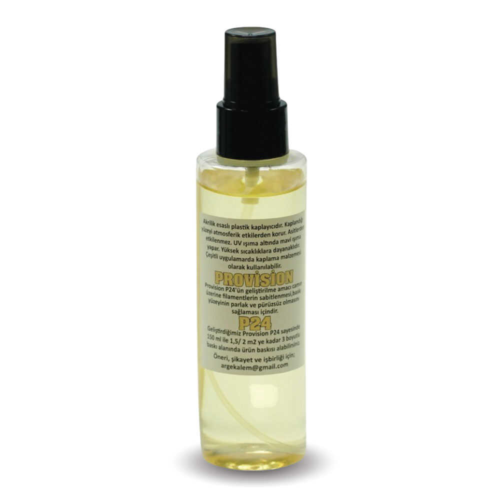 Provision P24, 3 boyutlu baskıların yazıcı tablasına yapışmasını sağlayan akrilik esaslı bir plastik kaplayıcıdır. ABS, PLA, Flex gibi plastik esaslı malzemelerin zemine tutunmasını sağlar. Filament kalkması ve kavlama problemlerinin önüne geçerek kaliteli bir baskı almanıza yardımcı olur. Uygulandığı cam yüzeyi atmosferik etkilerden korur ve asitlerden etkilenmez. Cam tabla ile kullanıma uygundur.