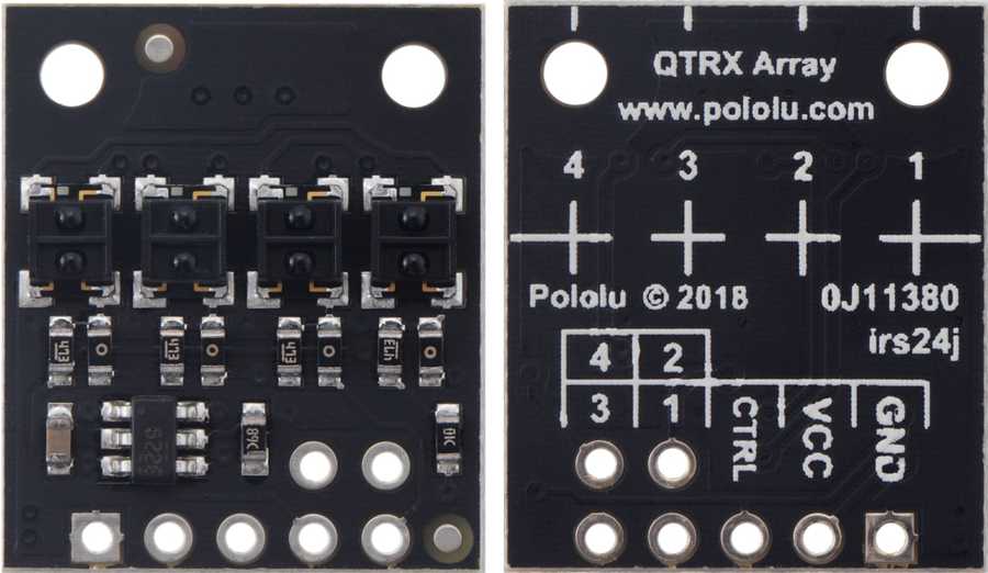 Two different sensor options are available, denoted by “QTR” or “QTRX” in the product name. The “QTR” versions feature lower-cost sensor modules without lenses while the “QTRX” versions feature higher-performance sensor modules with lenses, which allow similar performance at a much lower IR LED current. You can see the two different sensor styles in the pictures below of the 4-channel modules: