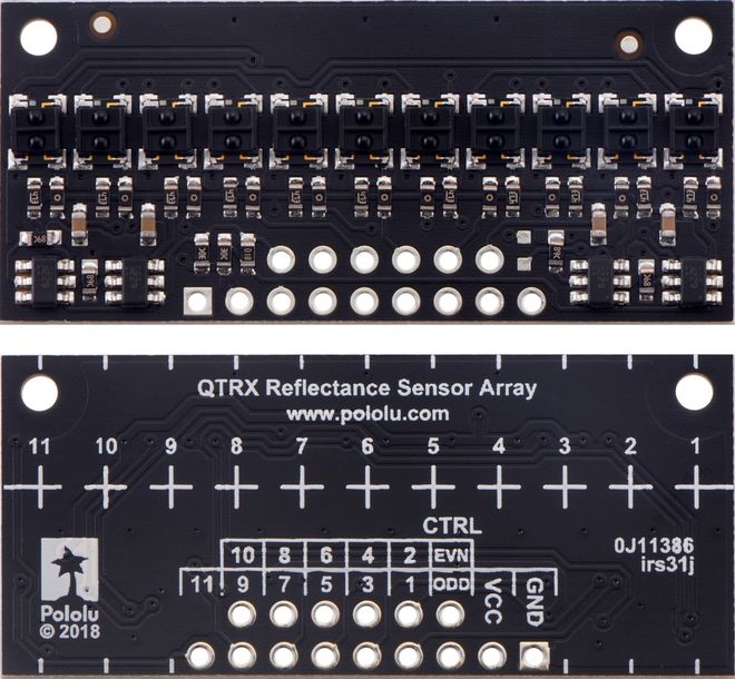 Two different sensor options are available, denoted by “QTR” or “QTRX” in the product name. The “QTR” versions feature lower-cost sensor modules without lenses while the “QTRX” versions feature higher-performance sensor modules with lenses, which allow similar performance at a much lower IR LED current. You can see the two different sensor styles in the pictures below of the 4-channel modules:
