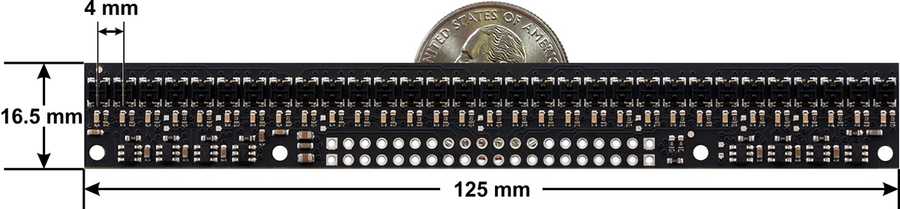 IR LED / fototransistör çifti dizisi, yansıtmadaki değişiklikleri (hat algılama gibi) tam olarak belirlemek için mükemmeldir. 2,9 V ila 5,5 V arasında çalışır ve besleme voltajından bağımsız olarak kısılabilir parlaklık kontrolü ile tek&çift yayıcılar için ayrı kontroller sunar. Genel olarak, nesne ne kadar yakınsa, açık ve koyu okumalar arasındaki kontrast o kadar yüksek olur, ancak yüksek yansıtıcılı nesneler genellikle yaklaşık 50 mm'ye kadar algılanabilir. Bu versiyon, lensli yüksek performanslı, düşük akımlı QTRX sensörlere sahiptir.