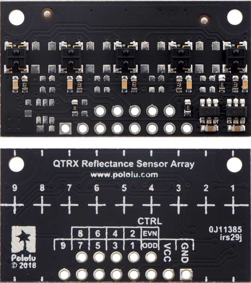 This array of IR LED/phototransistor pairs is great for precisely identifying changes in reflectance (like line detection). It operates from 2.9 V to 5.5 V and offers dimmable brightness control independent of the supply voltage. In general, the closer the object, the higher the contrast between light and dark readings, but high-reflectance objects are generally detectable out to around 40 mm. This version features high-performance, low-current QTRX sensors with lenses.