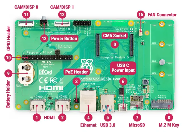 Compute Module 5 Compatibility: The CM5 IO Board is fully compatible with the Raspberry Pi Compute Module 5, enabling the use of the module’s power and features.