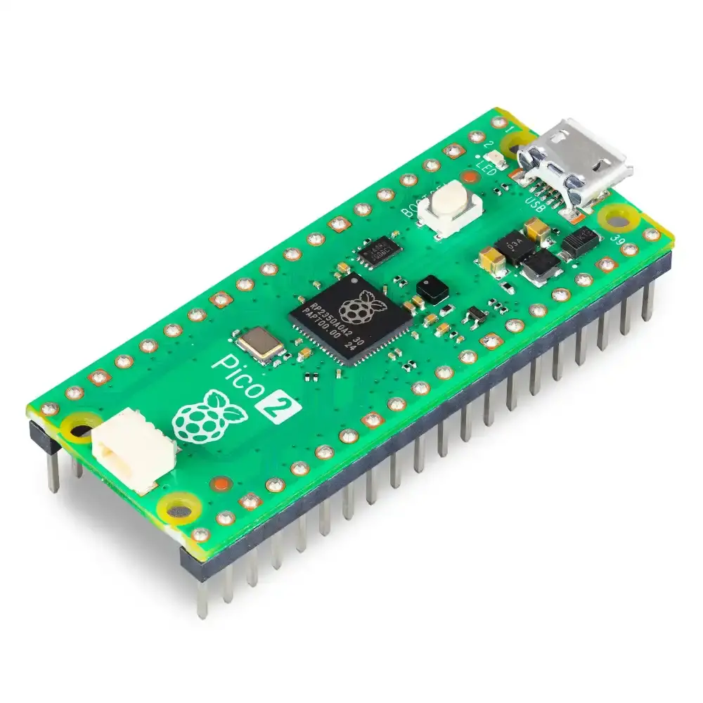 Raspberry Pi Pico 2, taşıyıcı kartlara doğrudan lehimlemeye olanak tanıyan kale biçimli bir modül olarak gelirken, header'lı Pico 2 önceden lehimlenmiş header'larla birlikte gelir.