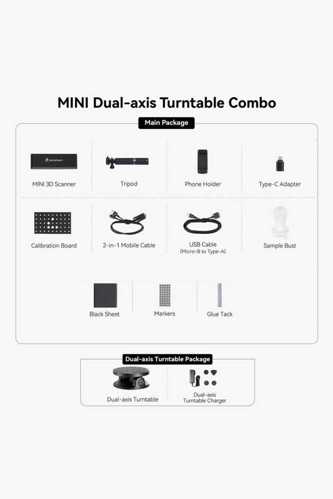 Çift eksenli döner tabla A230, Revopoint tarayıcılar için özel olarak üretilmiş bir aksesuardır. Hızlı nokta bulutu veri toplama için 360° yatay tasarıma, yaklaşık 30° dikey açıya ve kontrollü bir dönüş yoluna sahiptir. Daha önceki eksik veri toplama sorunlarını veya ortam tıkanıklığı gibi yanlış işlemlerden kaynaklanan delikleri çözerek tarama kalitesini ve verimliliğini büyük ölçüde artırır.