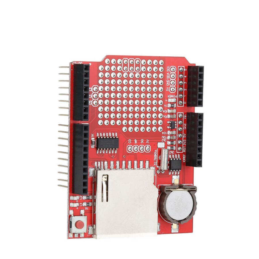 Shield kartı üzerine kendi devrenizi kurabilmeniz için prototipleme alanı bulunmaktadır. FAT ve FAT32 dosya sistemine sahip SD kartları kullanabilirsiniz. SD kartınızın zarar görmemesi için shield üzerinde 3.3V regülatör ve lojik seviye dönüştürücüsü yer alır. Kart üzerindeki RTC, CR1220 tipinde saat pili ile çalışmaktadır.