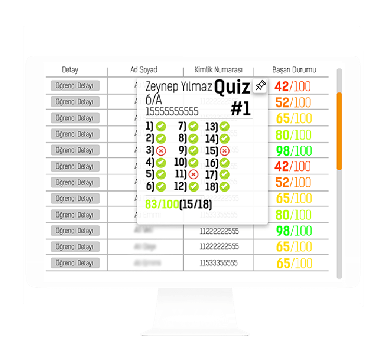 Öğrencilerin tüm aktiviteleri, performans verileri ve düzenleme ekranları öğrenci sayfalarında bulunur. Akıllı öğrenci profili sayesinde öğrenciler istedikleri zaman “karne” olarak adlandırdığımız performans analizlerini sistem üzerinde yazdırabilirler.