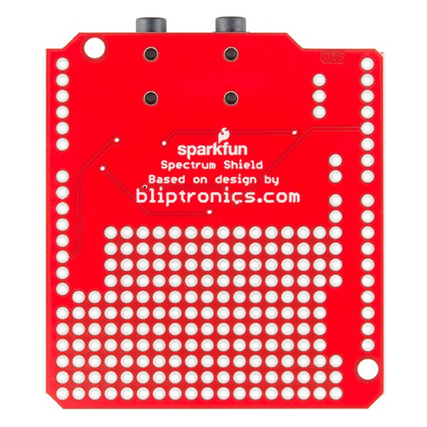 The Spectrum Shield features the MSGEQ7 graphic equalizer display filter. Two of these ICs allow you to split a stereo audio input into 7-bands (per channel) and read the amplitude of each using the ADC on your Arduino. The shield is populated with two 1/8" stereo jacks (like you would find on a pair of headphones). One serves as a stereo input and the other is a pass-through output which allows you to connect the Spectrum Shield in-line between your audio source and your stereo system without interruption. This revision of the Spectrum Shield has been updated to the Arduino R3 layout but still requires you to solder on your own headers. This shield can be used to create sound visualizers, detect patterns in music or add sound activation to your microcontroller projects.