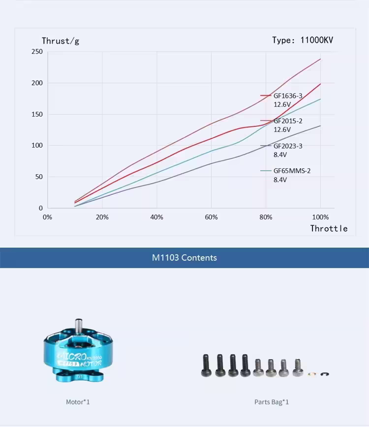 The T-Motor M1103 8000KV is an excellent choice for FPV micro drones with its structure that combines lightweight design and high performance. Thanks to its 2–3S LiPo compatibility, strong thrust, and stable operation, it delivers high efficiency especially in racing and freestyle categories. Precision manufacturing quality, durable materials, and an optimized magnetic structure minimize vibration and provide a smoother flight experience.