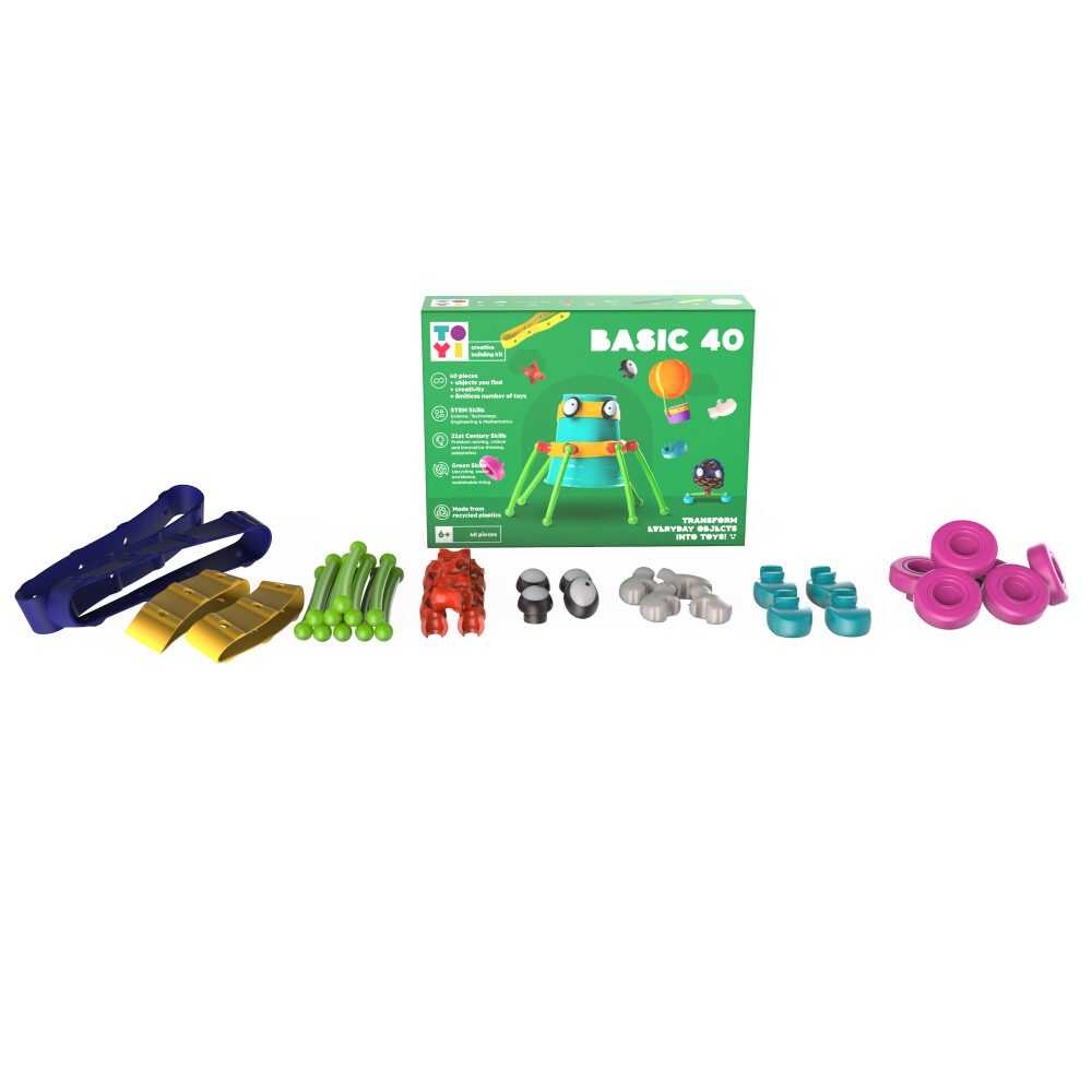 Toyi, çocukların etraflarındaki her şeyi eşsiz oyuncaklara dönüştürmelerini sağlayan, sınırsız, yönergesiz yaratıcı bir oyun kiti. 40 Toyi parçasından oluşan Başlangıç Kiti ile bir su şişesini, altı kollu bir robota; eski kutuları, tren vagonlarına; veya bir kozalağı, sevimli bir canavara dönüştürün. - Toyi ile her çocuk bir oyuncak tasarımcısı