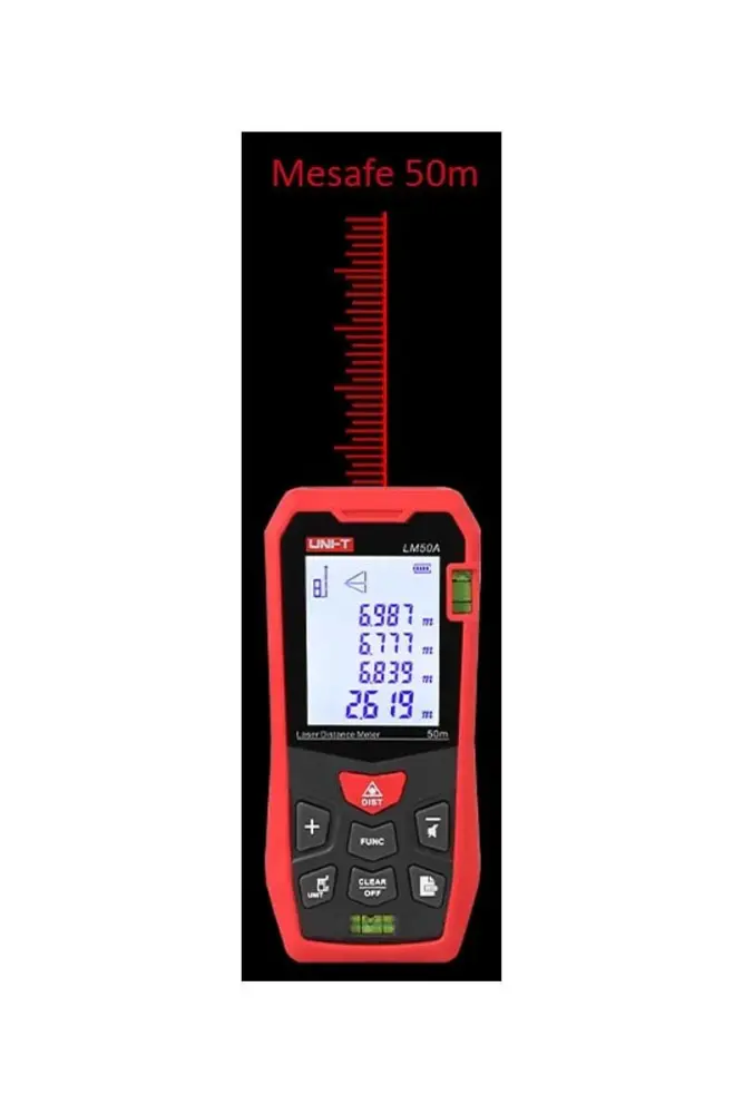 The LM50A is equipped with a laser that can make fast and accurate measurements. This allows you to easily determine distances and can enhance efficiency in areas such as project planning or construction work. Additionally, this laser meter can work in fractional distance units and different measurement modes, ensuring results that suit various measurement requirements.