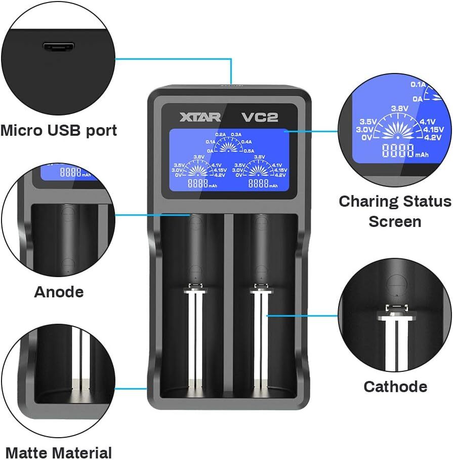 Xtar VC2 is a portable charger capable of safely and intelligently charging 2 Li-ion batteries simultaneously. Thanks to its LCD screen, you can easily monitor the battery capacity, charging current, voltage, and charging status. It offers practical use both at home and while traveling.