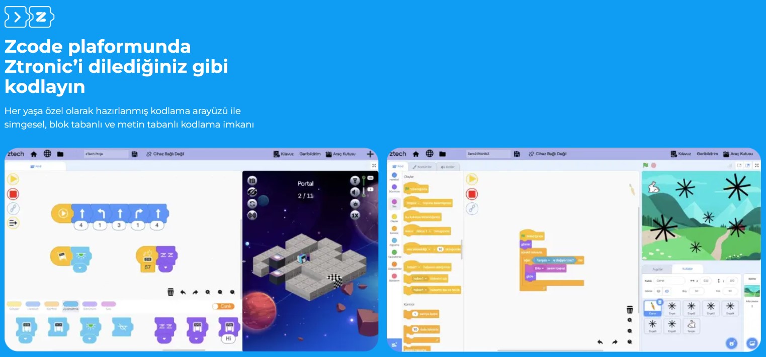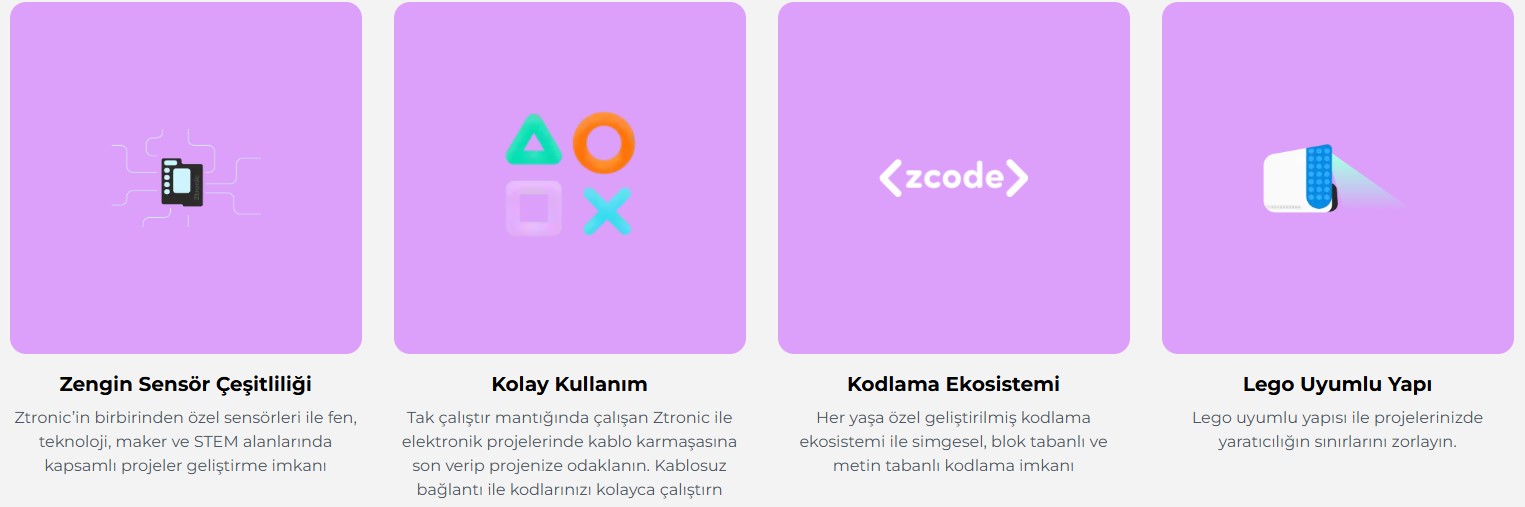 Ztronic is a fun electronic project set that works with plug-and-play logic, allowing students to easily develop electronic projects at an early age. Ztronic offers a unique project development experience with its Lego-compatible structure, coding interfaces suitable for all ages, and rich sensor variety.